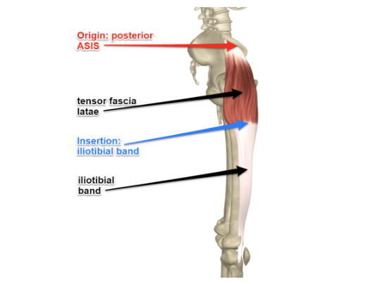 This band also has attachments onto the Tensor fascia latae (TFL) and glute max muscle and plays a role in stabilising the pelvis, hip and knee.