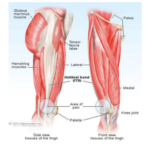 The ilio-tibial band is a connective tissue that connects from the outside of your hip to the outside of your knee. A bursa (fluid filled sac) helps to cushion where the band attaches onto the knee and this helps to reduce the amount of friction/rubbing occurring as the knee bends and straightens.